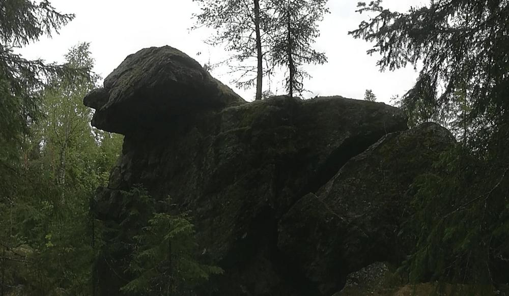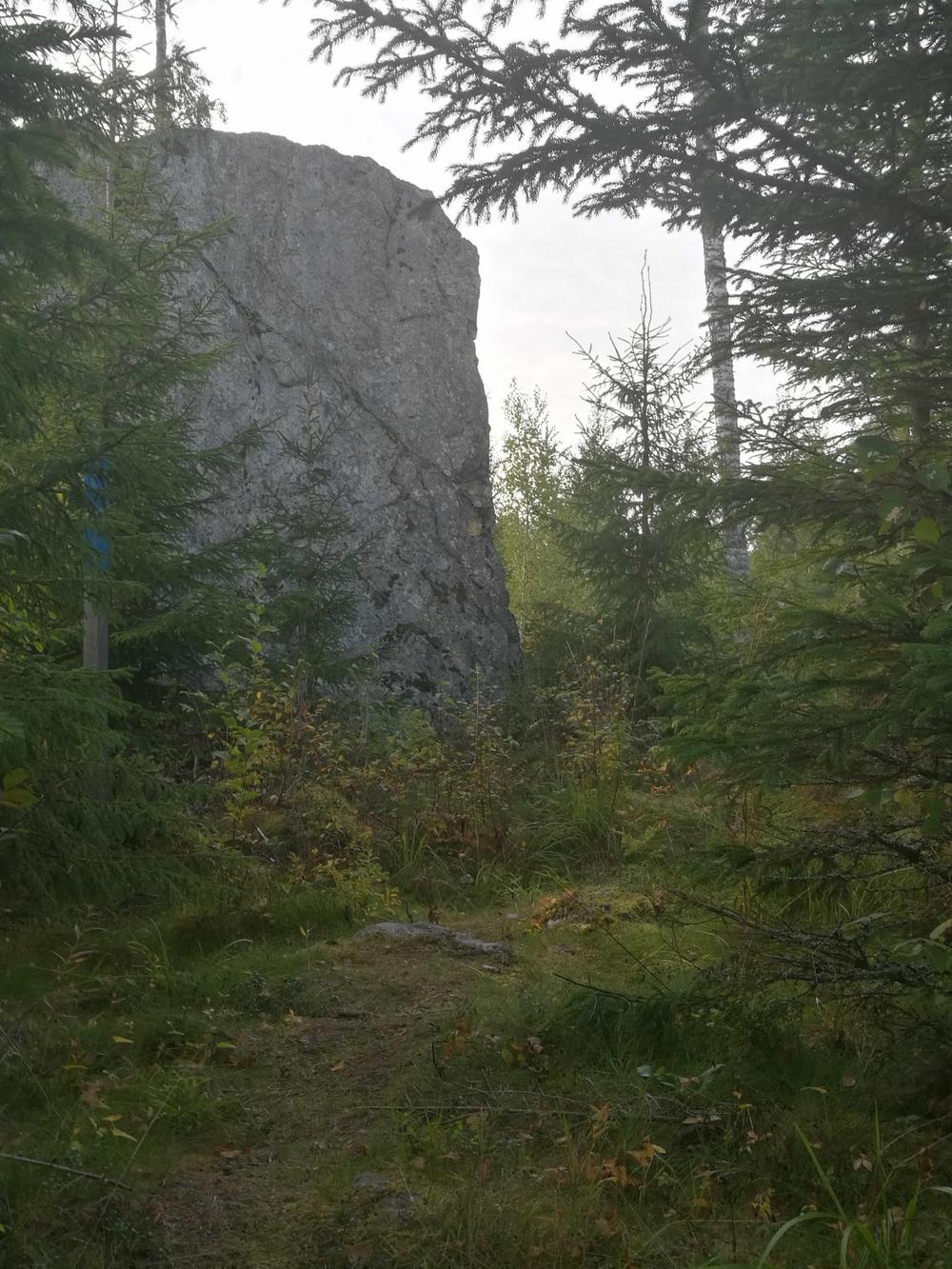 Ensimmäinen vaihtoehto jatkaa Koukkurahkan yli ja palata lähtöpisteeseen Hervantajärven pohjoispuolta. Koukkurahkan voi ylittää läntistä reittiä, kuten kuvassa 1, tai sitten tuonne GPX:n puolelle on merkattu myös itäisempi reitti Koukkurahkan yli. Molemmat mahdollisuudet on esillä kuvassa 3. Suosittelen läntistä, koska siellä on paljon hyvää polkua. Itäisempi reitti on suurilta osin kasvanut umpeen ja siellä olevat pitkospuut ovat lähes täysin lahonneet. Itäisemmälle reitille osuu kuitenkin Eevertinkivi, josta kuva ohessa. Se on tuo etäisesti sfinksiä muistuttava siirtolohkare. Sitä voi käydä katsomassa, vaikka muuten läntistä reittiä kulkisikin. Kovin vahvoja polkuja Koukkurahkalla ei ole.